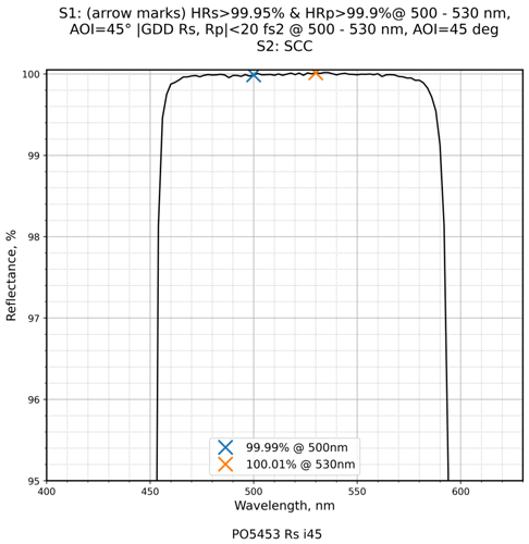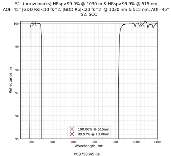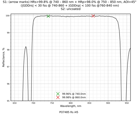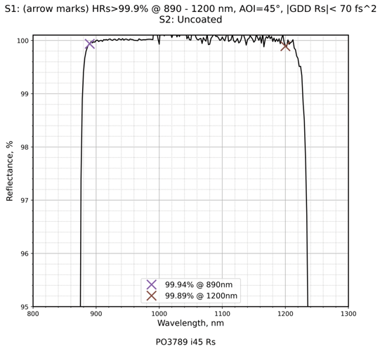 飞秒激光平面反射镜的高反射率可最大限度减少激光系统中的能量损失,确保激光脉冲的高效传输。为了保持飞秒激光脉冲的时间特性,反射镜设计需具备低且均匀的GDD。并且在超短脉冲传播中,任何光谱成分的时间延迟都会影响脉冲压缩和形状,低GDD的反射镜能确保脉冲保持高质量和时间分辨率。反射镜具有卓越的表面质量,确保极低的散射和吸收损耗。这种表面精度在减少不必要损耗的同时,提高了系统的整体性能。